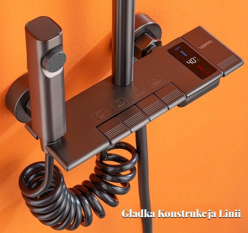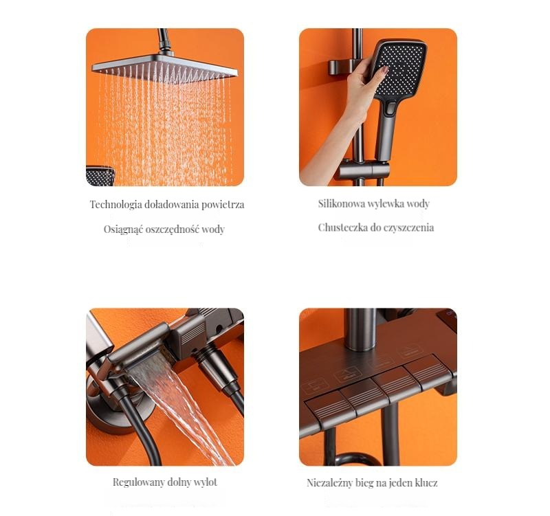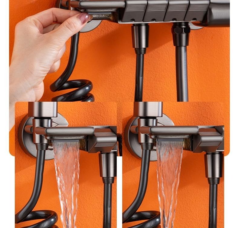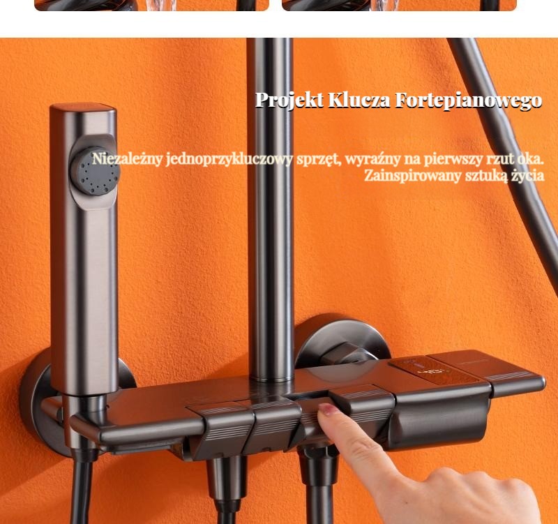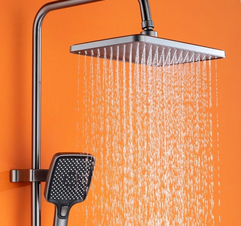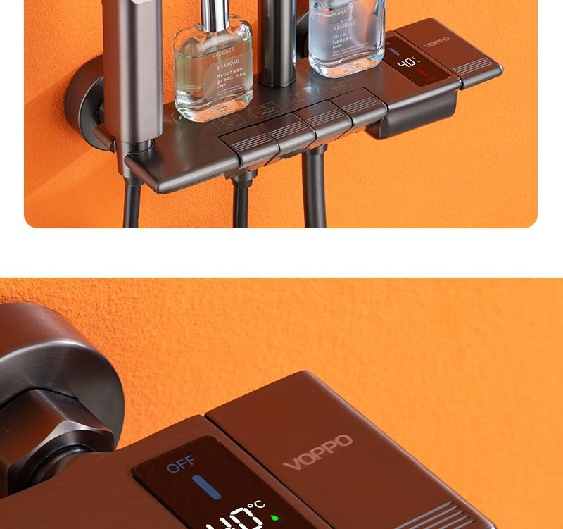 Shower six-piece set. It features a smart thermostat, digital display, hydronic power, piano buttons, brass body and four mode setting options and can be dispatched within 24 hours!