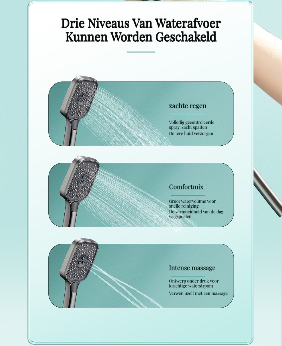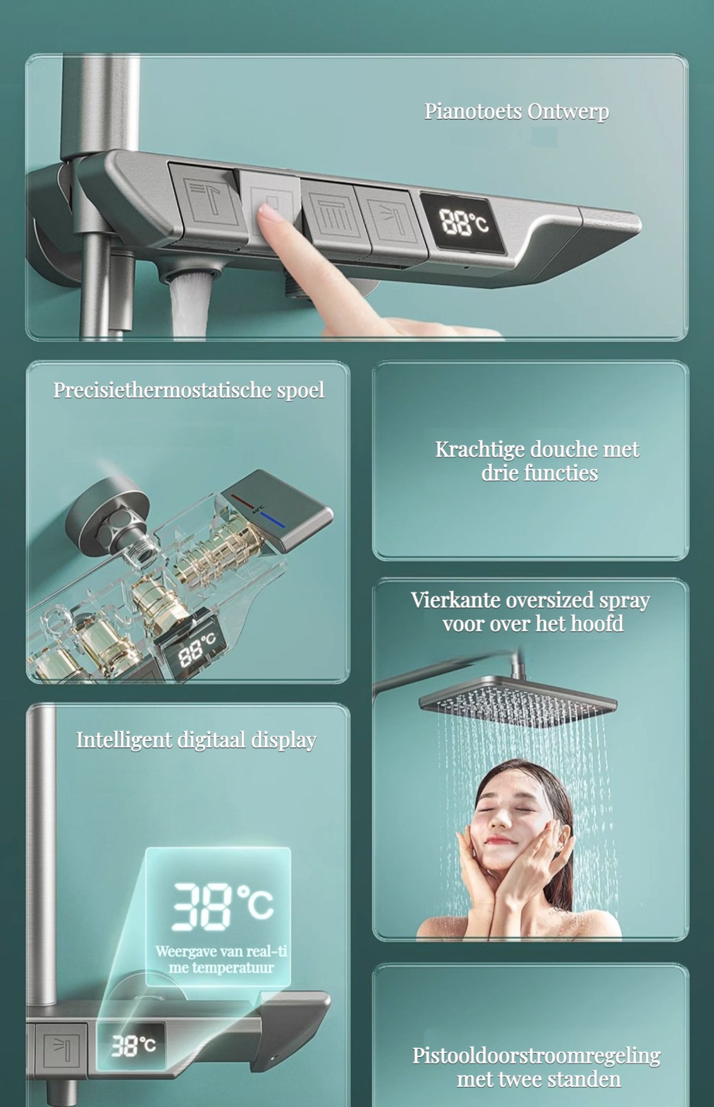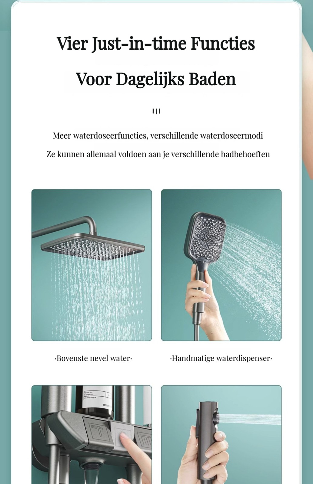 Zesdelige doucheset. Hij is voorzien van een slimme thermostaat, digitaal display, hydronisch vermogen, messing body en vier waterdoseringsstanden! Koop nu voor 50% korting!